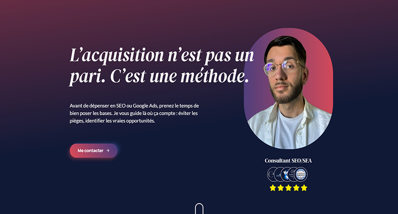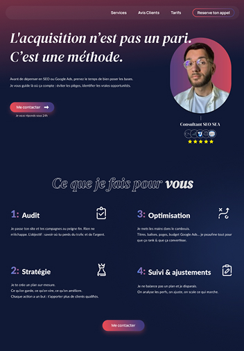 SEO intégréOptimisation technique complète : vitesse, structure, référencement naturel. Pour le SEO stratégique, je collabore avec des experts partenaires.